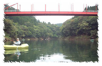 右は,当日の最初の魚をあげたU氏。 スタートから(開始と言っても,この日は花火は鳴らさず,準備完了の方から流れ開始であったが)わずか,3秒後には釣り上げられた70UPの魚である。(画像の関係で,20cmほどにしか見えないところが残念である。) 他の諸氏はまだ,今から出撃しようと,指を加えて眺めているだけであった。 |
